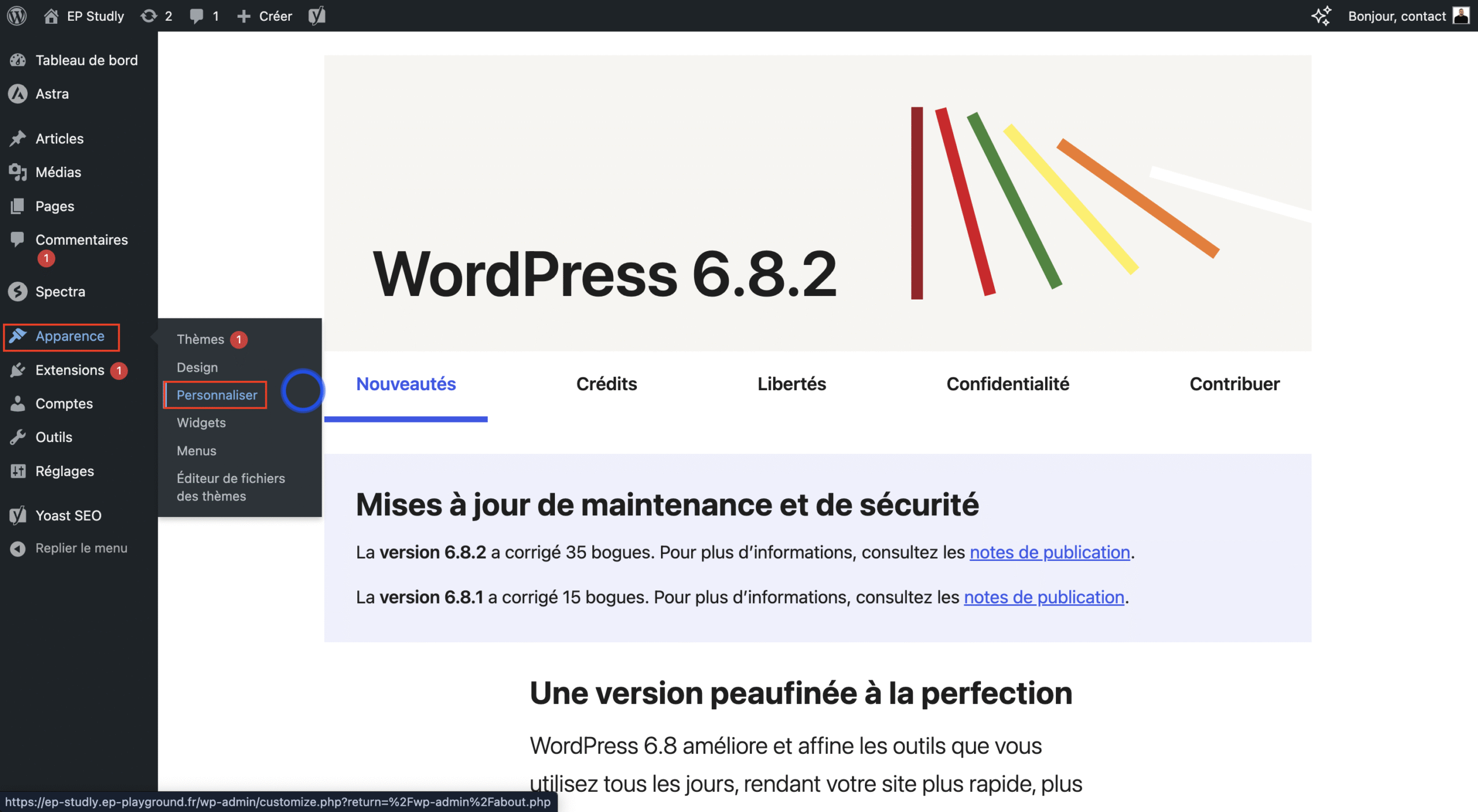 - Depuis le back-office, allez dans Apparence > Personnaliser.