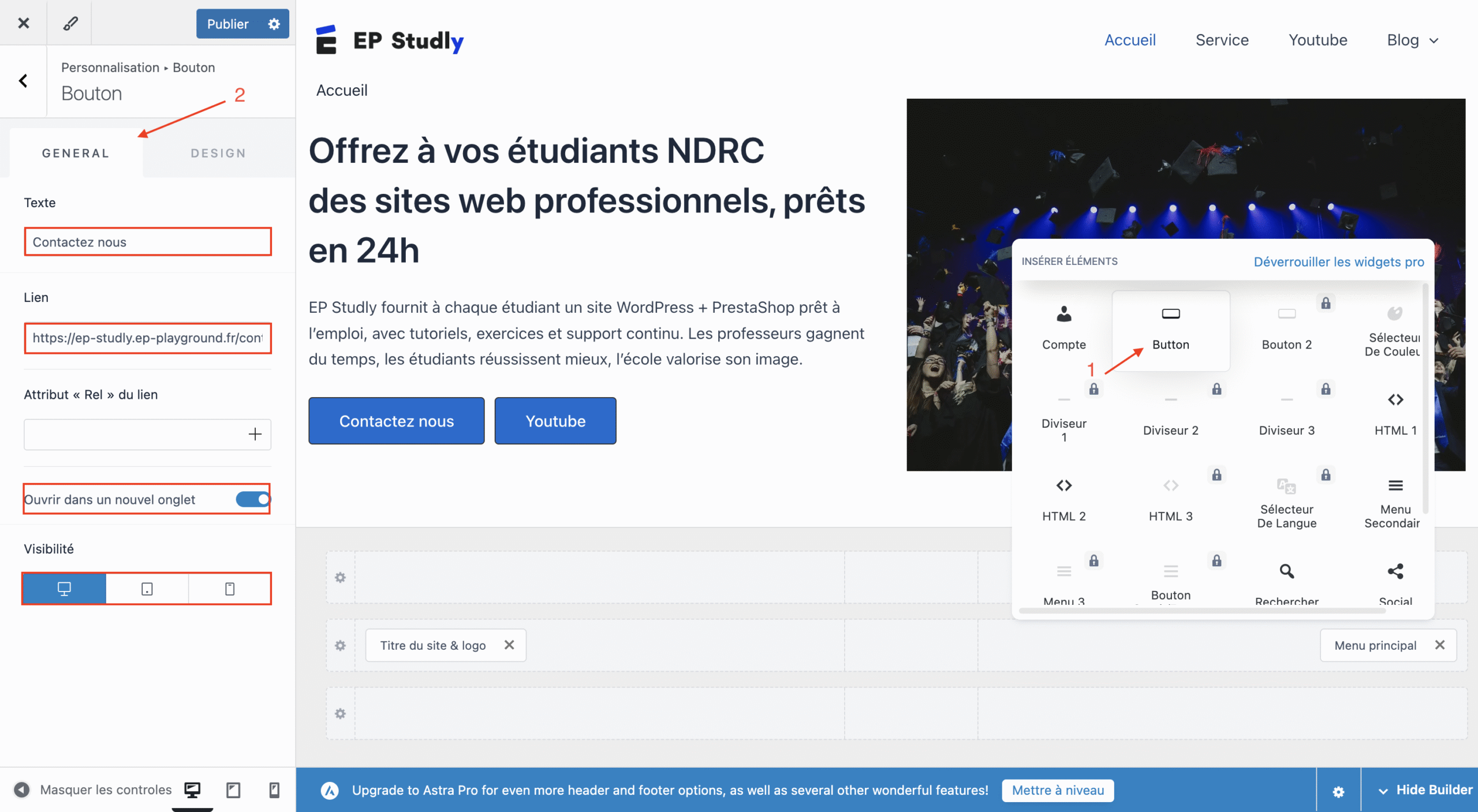 - Bouton configuré (texte, lien, design)