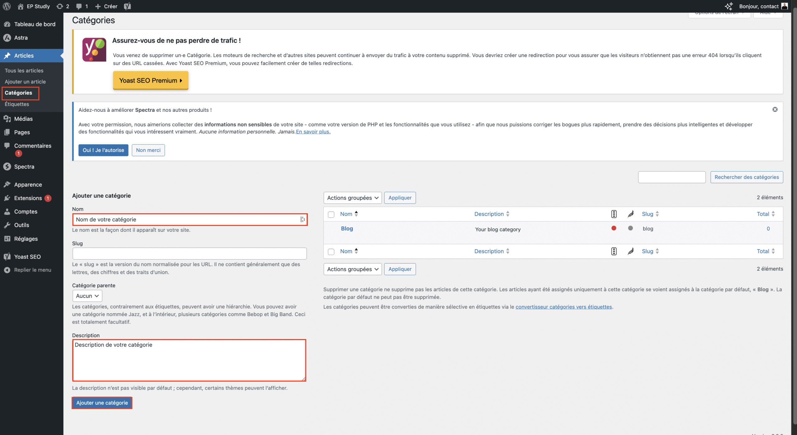 • Depuis Articles > Catégories, saisissez un nom (ex. Catégorie 1).