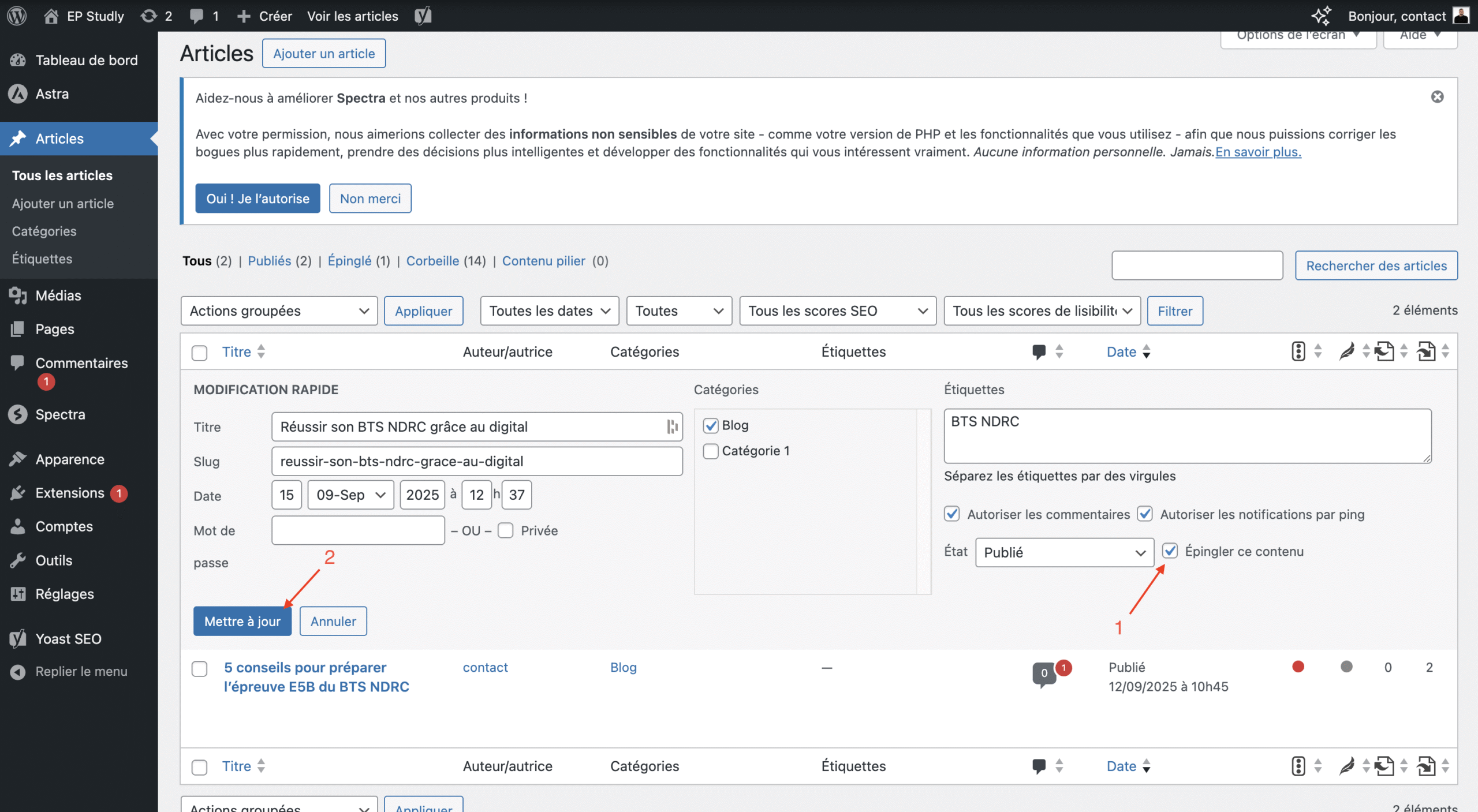 👉 Cette fonctionnalité permet de garder un contenu prioritaire (ex. : “5 conseils pour réussir l’épreuve E5B”) en haut de la liste des articles, même si d’autres articles plus récents sont publiés.