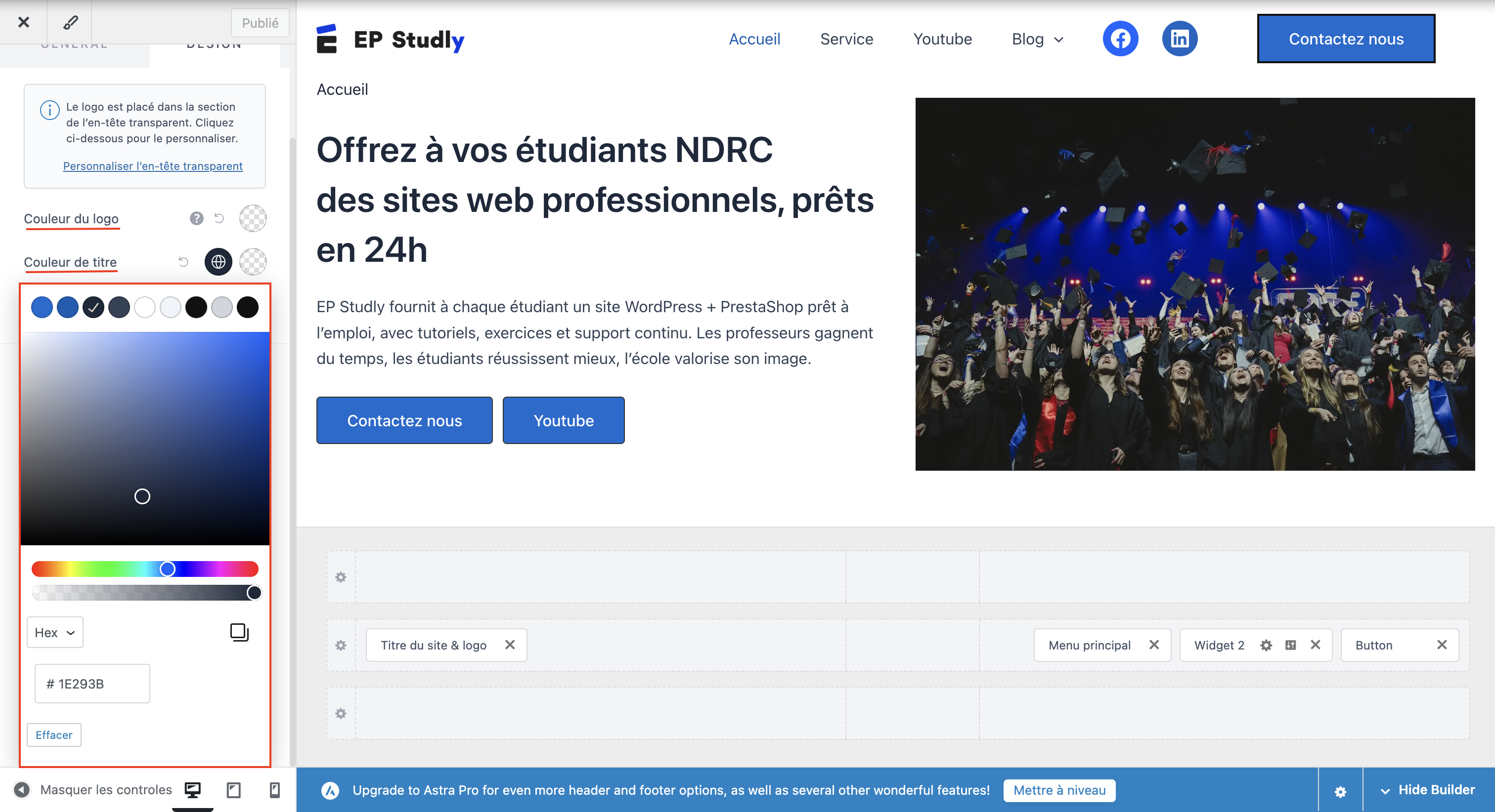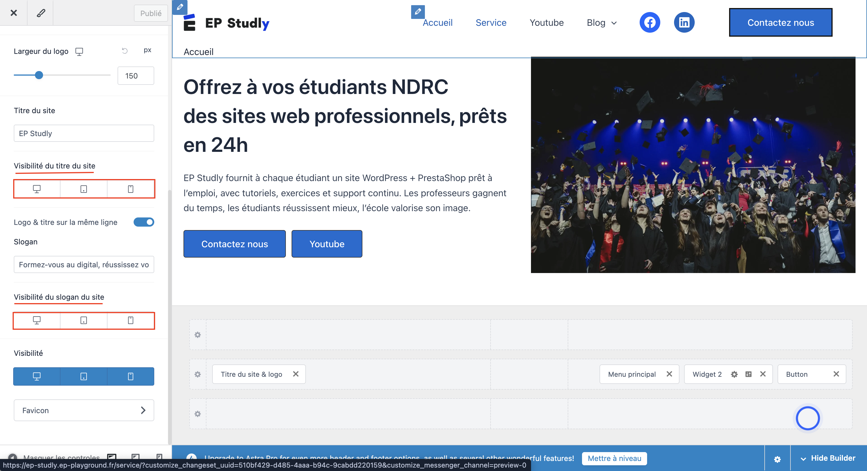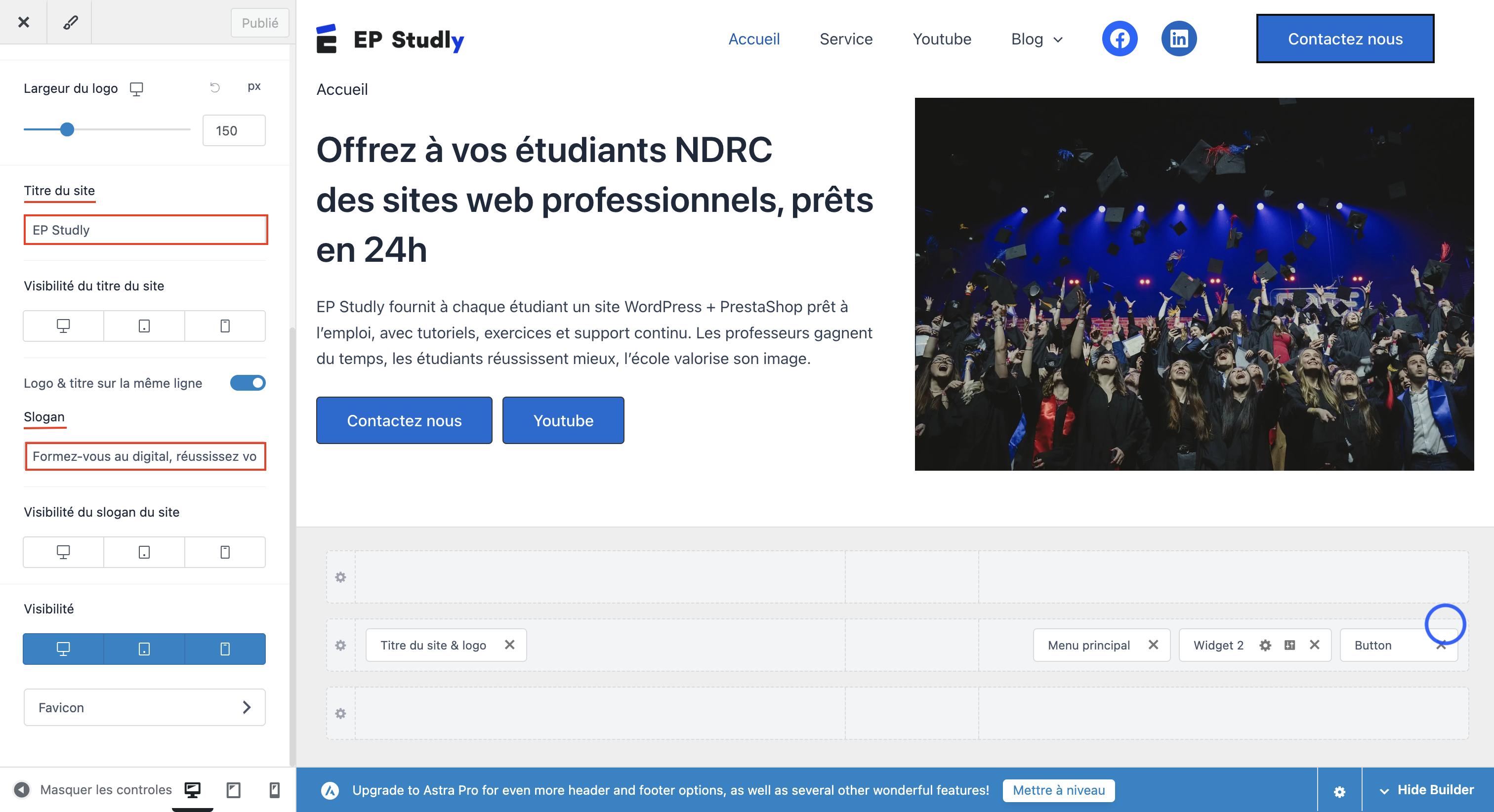 Ensuite, ajoutez un titre de site (court et clair, ex. “EP Studly”) et un slogan accrocheur (ex. “Formez-vous au digital, réussissez votre BTS NDRC”).