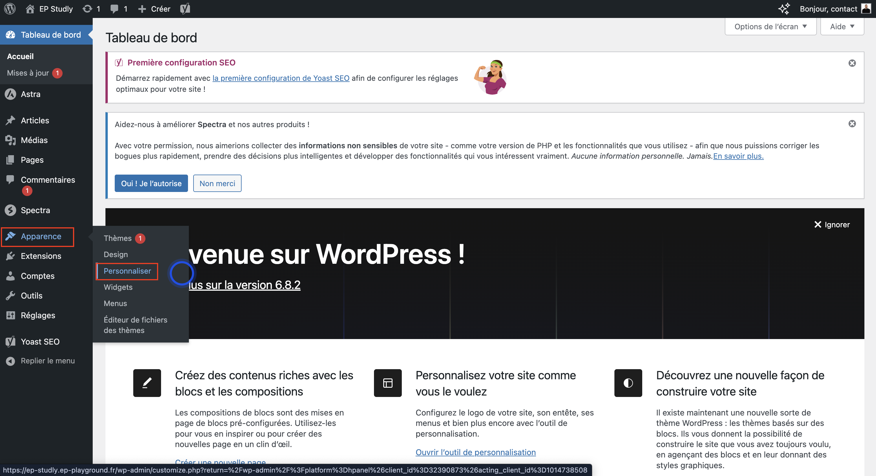Dans Apparence > Personnaliser > Identité du site, vous pouvez importer un logo et une icône (favicon) depuis la médiathèque. Le logo doit être lisible, et l’icône carrée (512×512 px) pour un affichage optimal dans les navigateurs.